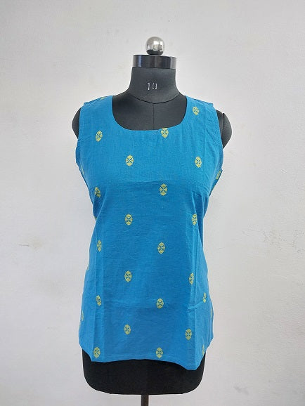 Introducing our Blue Jamdani Kurti, expertly crafted from pure cotton for a comfortable and versatile fit. This hip length top is perfect for pairing with jeans or skirts, making it a must-have addition to your wardrobe. Update your style with this beautiful and timeless piece.